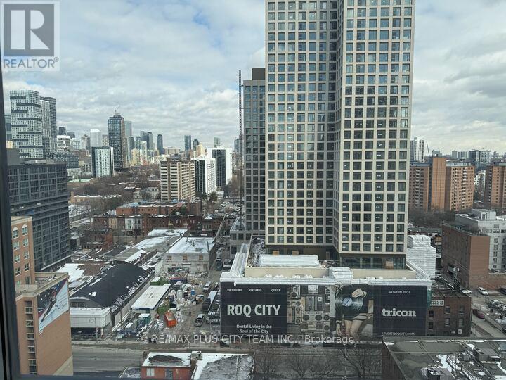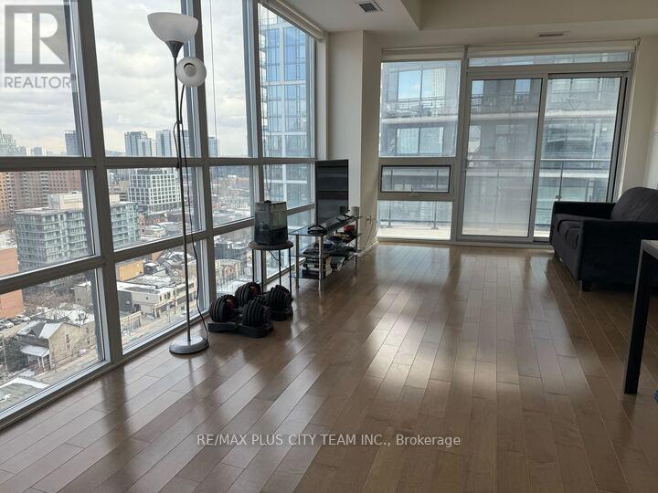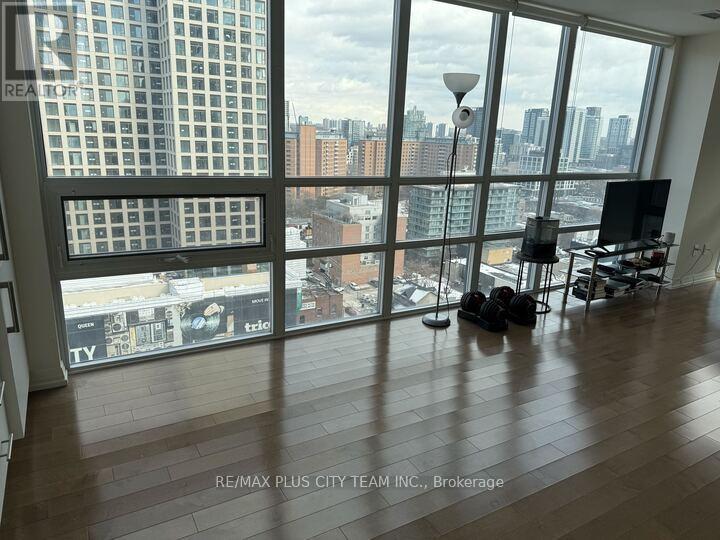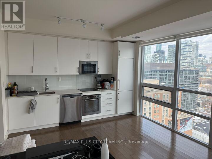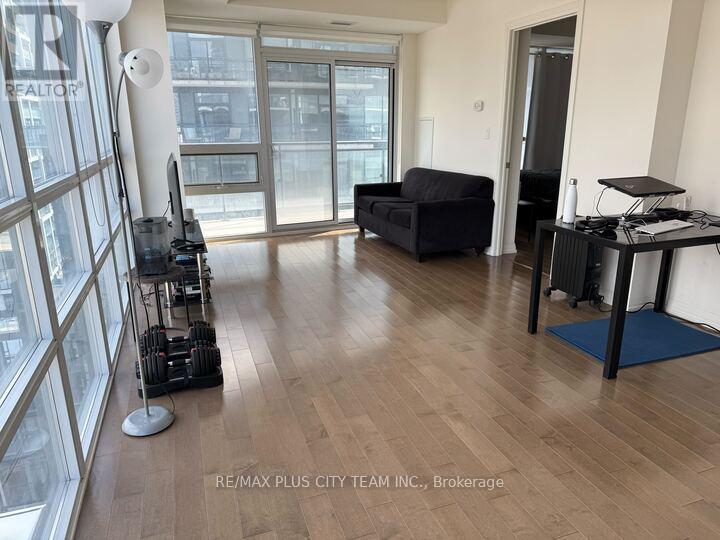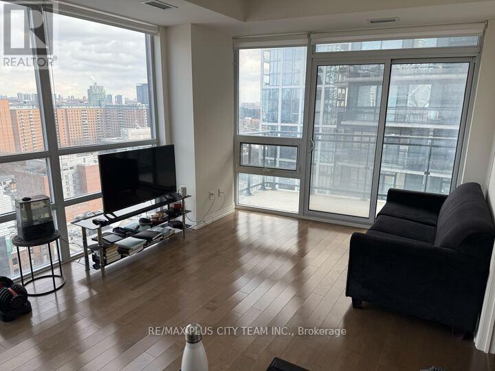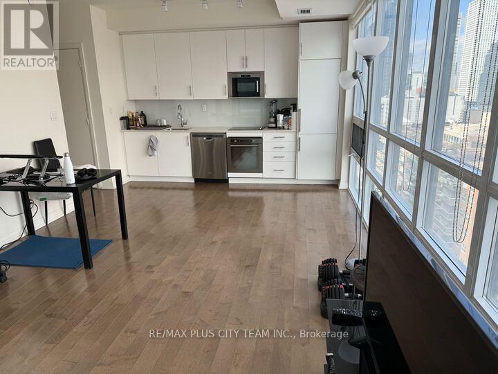Bright and spacious 1-bedroom suite at Axiom Condos offering over 600 sq ft of thoughtfully designed living space with floor-to-ceiling windows and expansive city views. This sun-filled unit features an open-concept layout with dark hardwood flooring throughout and a modern kitchen equipped with full-sized stainless steel appliances, sleek cabinetry, and ample counter space. The generous living and dining area is framed by a dramatic window wall, creating an airy atmosphere and showcasing impressive skyline views. The well-proportioned bedroom offers privacy and comfort, while the functional layout maximizes both space and natural light. Residents enjoy access to premium amenities including 24-hour concierge service, theatre room, games room, pet spa, residents' lounge, state-of-the-art fitness centre with saunas and yoga studio, outdoor terrace, and sky deck with panoramic city views. Private dining and party rooms are also available for entertaining. With a Walk Score of 97, this unbeatable location places you steps to shops, restaurants, cafés, grocery stores, parks, transit, and vibrant cultural destinations. Photos were taken when the unit was vacant. (id:31565)