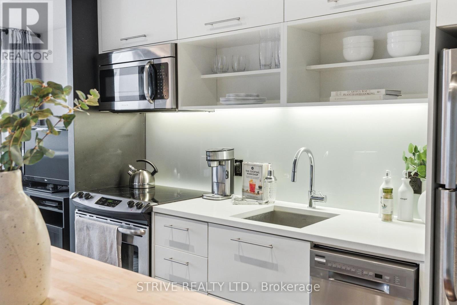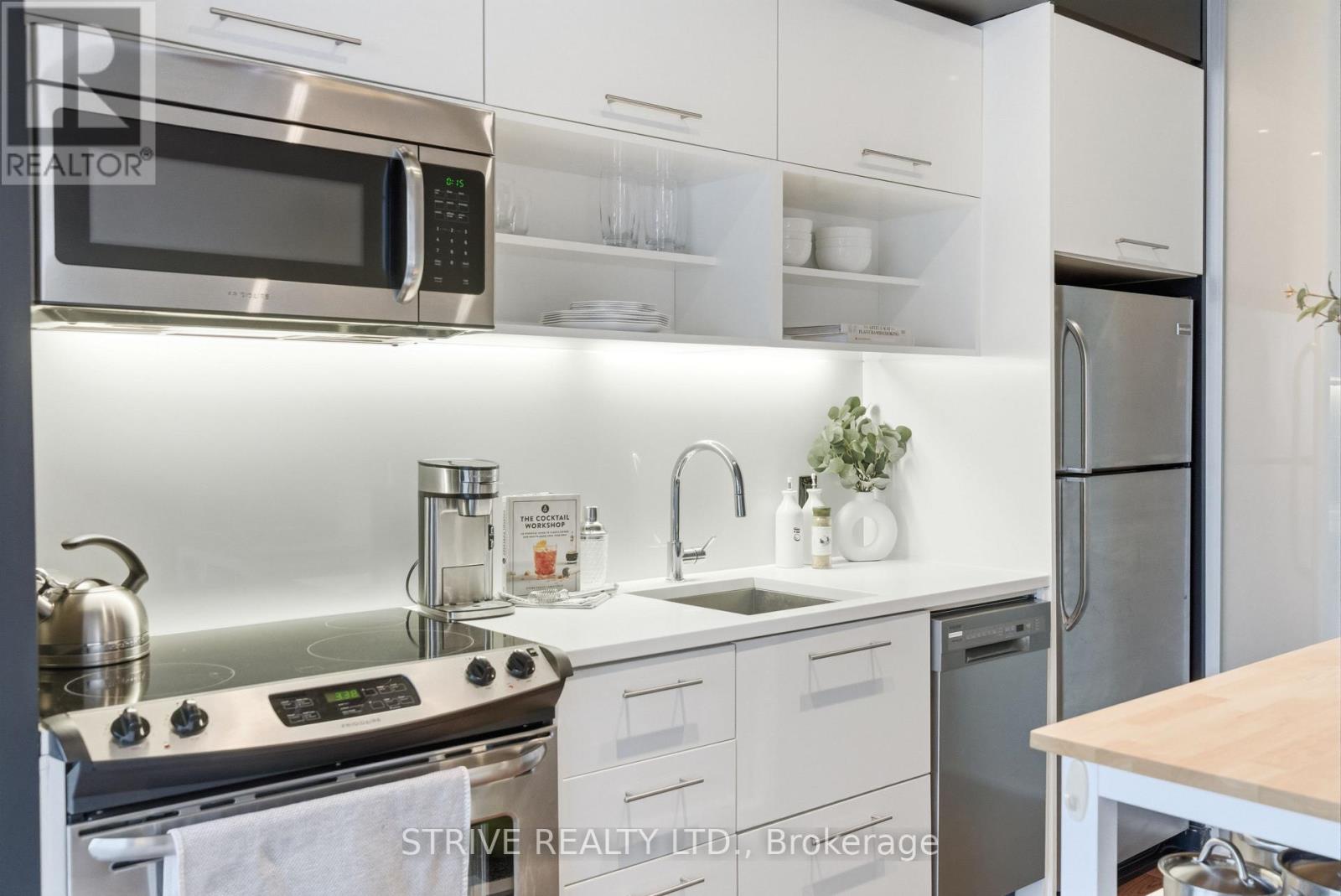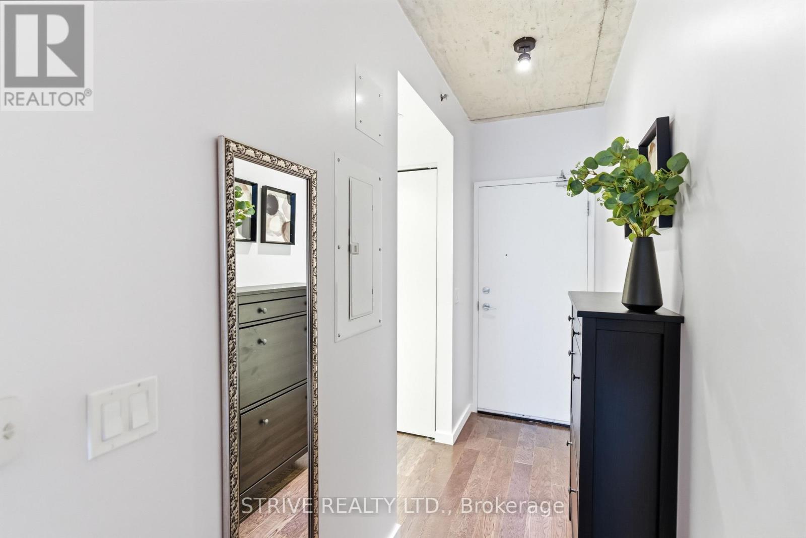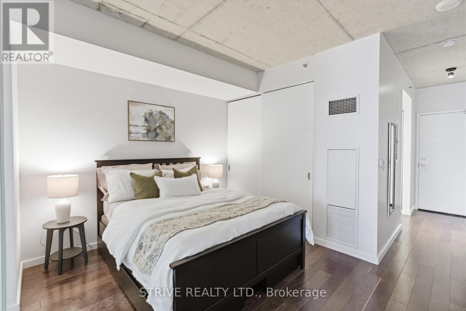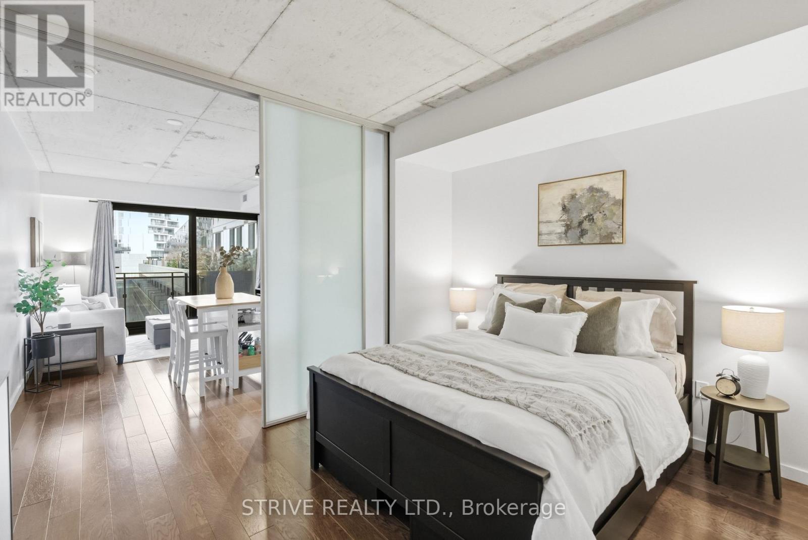 Completed in 2013, River City Phase 1 is a LEED Gold-certified building in the vibrant Corktown and West Don Lands communities, with easy access to Riverside, Leslieville, the Distillery District, St. Lawrence Market, Corktown Commons, the Don River Valley, Toronto's Waterfront Trail, and the DVP. The TTC 504 King streetcar is right at your doorstep with routes 503 and 501. This modern loft-style suite offers approximately 550 sq ft of functional living space, plus a 55 sq ft balcony with composite decking panels. Located on the 6th floor, the unit provides direct access to the interior walkway connecting to the adjoining building and outdoor courtyard and pool. It boasts a superior south-facing exposure overlooking the pool area, flooding the space with natural light. Features include 9-foot exposed concrete ceilings and stylish walnut hardwood flooring throughout. The contemporary white kitchen is equipped with stainless steel appliances, new dishwasher, and grey quartz countertops. The spa-inspired, fully tiled bathroom features a soaker tub, updated vanity and toilet, mirrored cabinet, and convenient ensuite laundry. Outstanding building amenities include 24-hour concierge, outdoor courtyard and swimming pool with community BBQ areas, fully equipped fitness centre, two spacious party rooms with lounge, bar, kitchen, dining area and billiards table, guest suite, and sun deck. Come make the celebrated River City development your home and enjoy the perfect blend of modern living, convenience, and style. (id:31565)