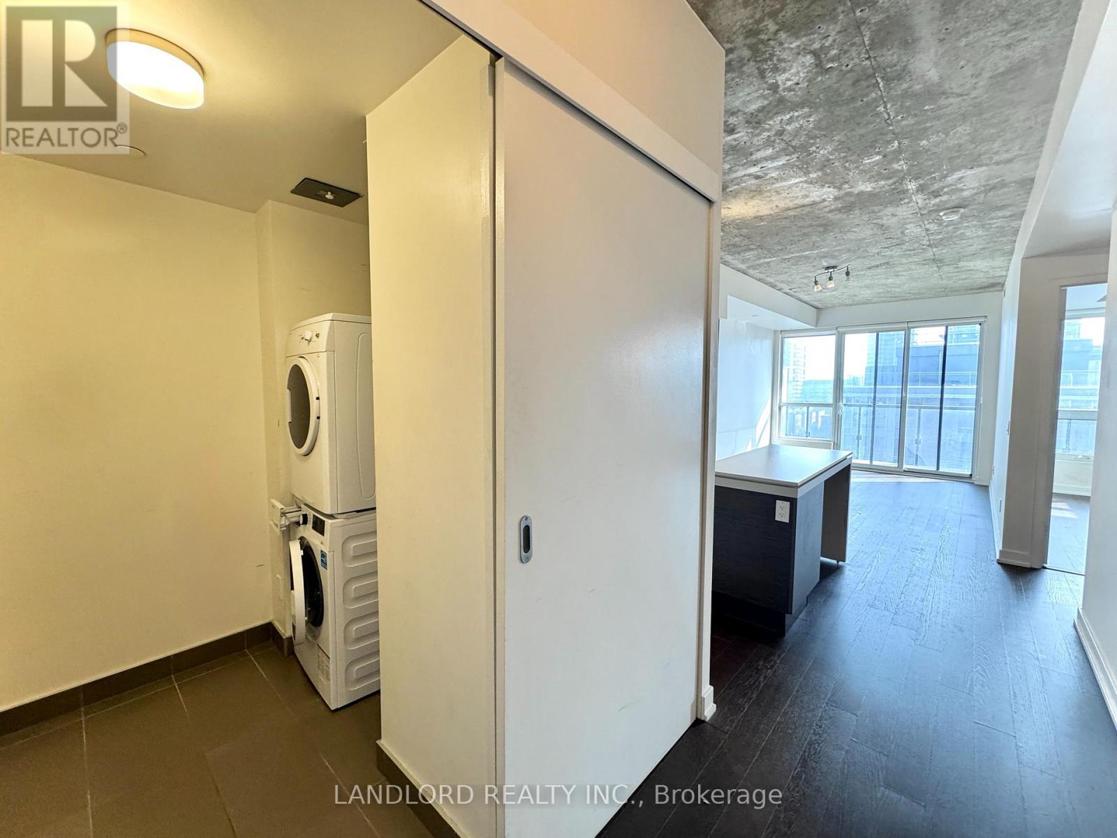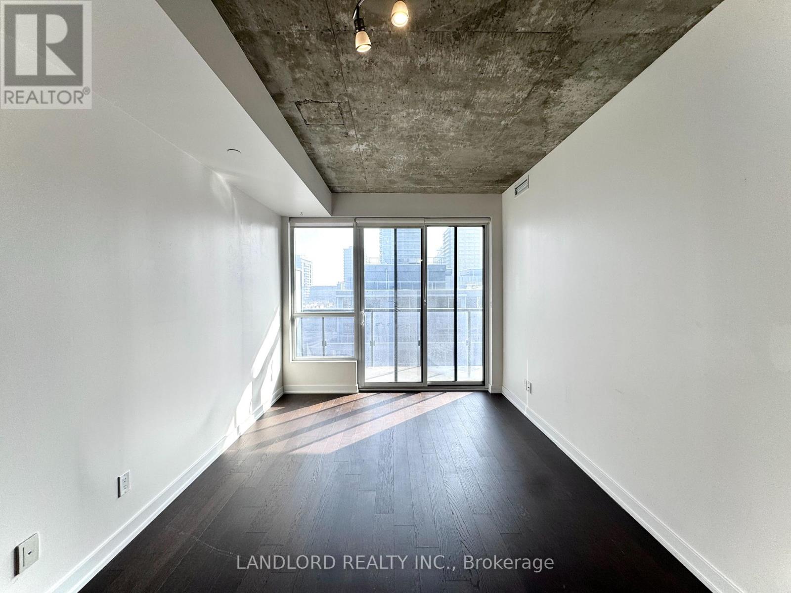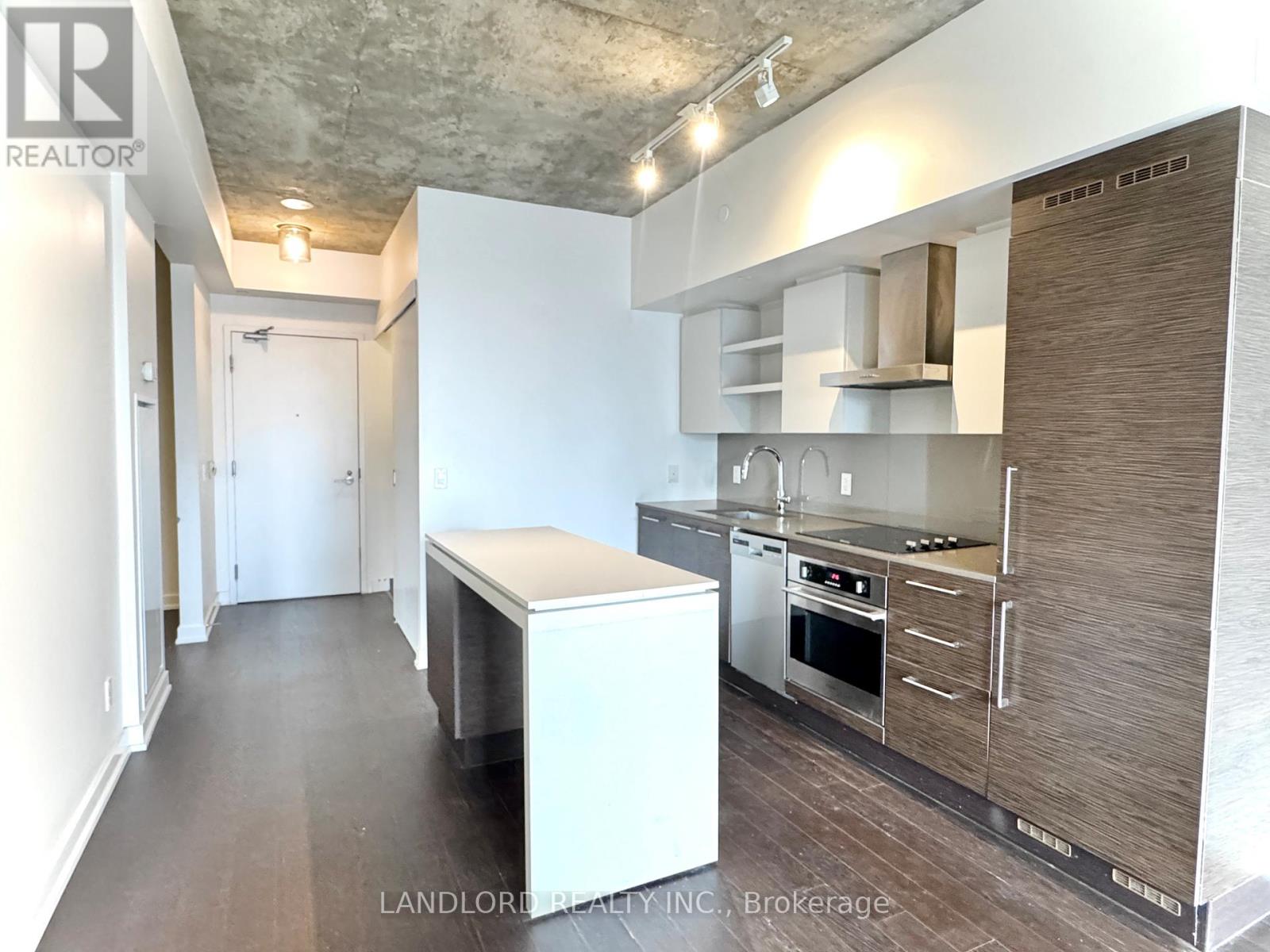 Professionally Managed 1 Bed + Den, 1 Bath Suite Featuring A Contemporary Kitchen With Built-In Appliances, Stone Countertops, And A Centre Island With Breakfast Bar. The Bright Open-Concept Living Area Offers A Seamless Walk-Out To A Generously Sized Private Balcony. The Spacious Bedroom Showcases Wall-To-Wall Windows That Fill The Space With Abundant Natural Light, While The Separate Den Provides An Ideal Home Office Or Study Space. Hardwood Flooring Throughout And Exposed Concrete Ceilings Create A Modern, Loft-Inspired Atmosphere. Enjoy The Convenience Of Ensuite Laundry And The Benefits Of An Exceptional Walk Score Of 96. Situated In A Prime Downtown Location Steps From Trendy Restaurants, Vibrant Nightlife, Boutique Shopping, Transit, And Iconic Landmarks Including The CN Tower And Rogers Centre. A Must See! **Appliances: Fridge, Cooktop range, B/I Oven, B/I Microwave, Dishwasher, Washer and Dryer **Utilities: Heat & Water Included, Hydro Extra **Parking: 1 Spot Included (id:31565)