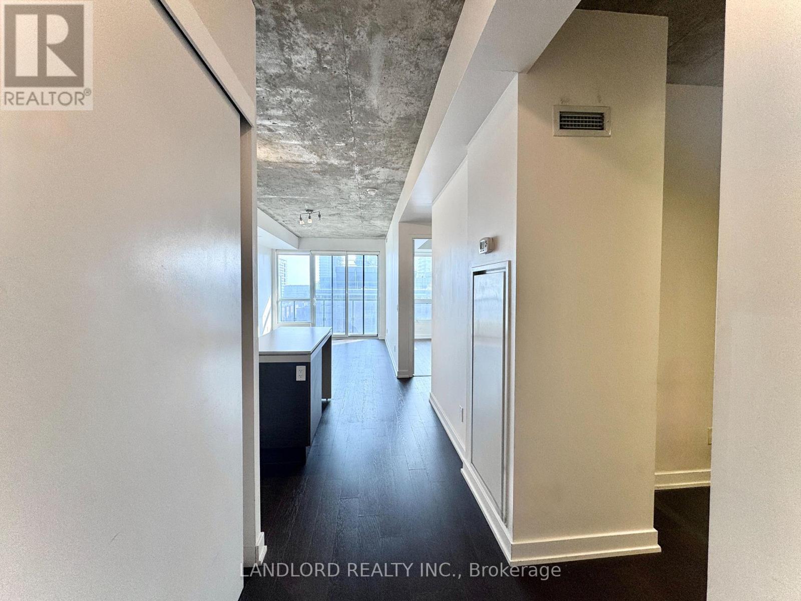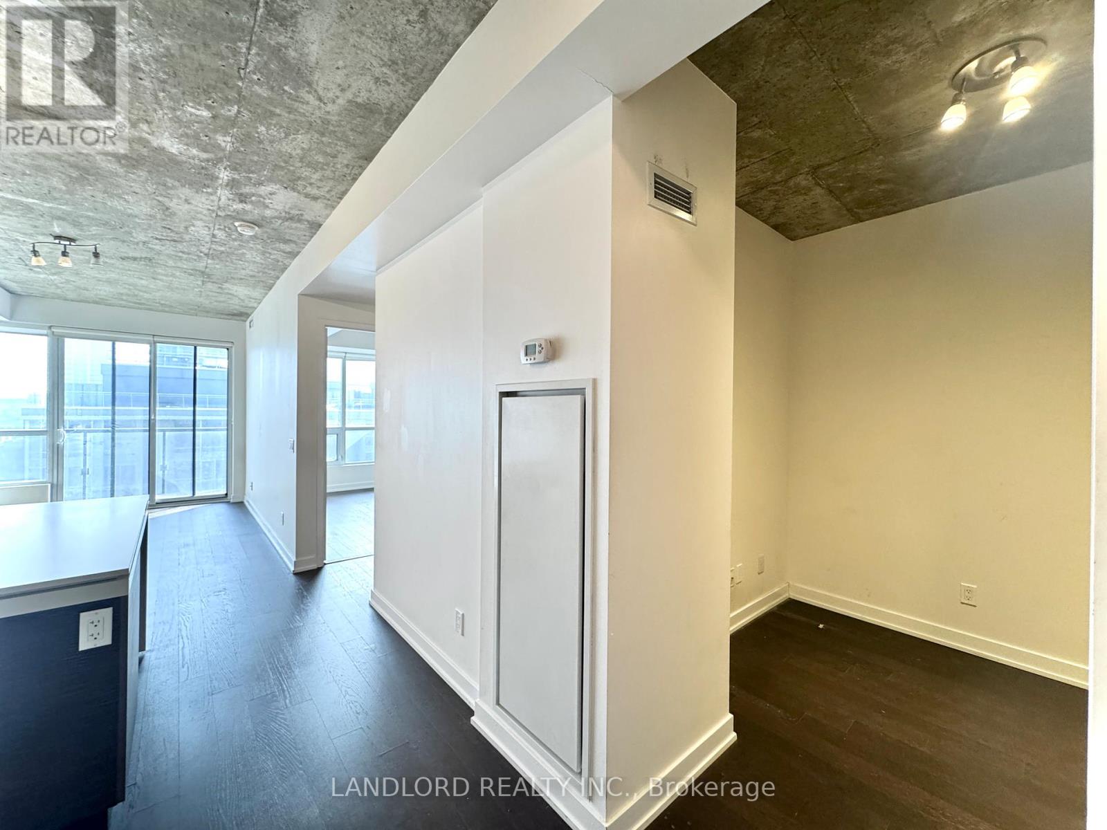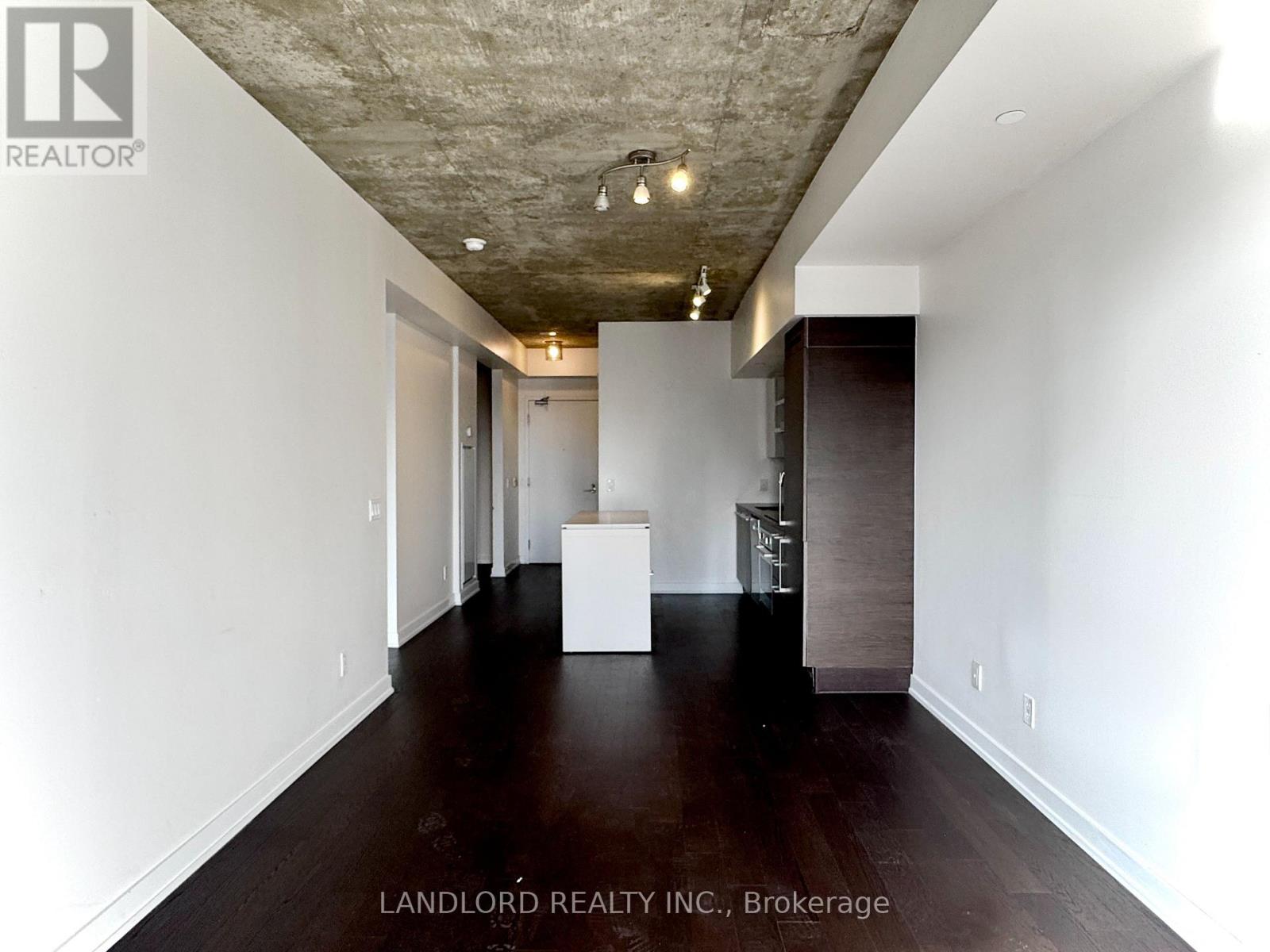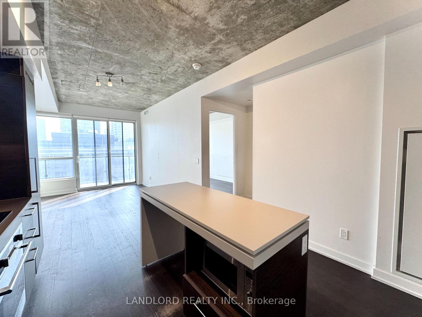 Professionally Managed 1 Bed + Den, 1 Bath Suite Featuring A Contemporary Kitchen With Built-In Appliances, Stone Countertops, And A Centre Island With Breakfast Bar. The Bright Open-Concept Living Area Offers A Seamless Walk-Out To A Generously Sized Private Balcony. The Spacious Bedroom Showcases Wall-To-Wall Windows That Fill The Space With Abundant Natural Light, While The Separate Den Provides An Ideal Home Office Or Study Space. Hardwood Flooring Throughout And Exposed Concrete Ceilings Create A Modern, Loft-Inspired Atmosphere. Enjoy The Convenience Of Ensuite Laundry And The Benefits Of An Exceptional Walk Score Of 96. Situated In A Prime Downtown Location Steps From Trendy Restaurants, Vibrant Nightlife, Boutique Shopping, Transit, And Iconic Landmarks Including The CN Tower And Rogers Centre. A Must See! **Appliances: Fridge, Cooktop range, B/I Oven, B/I Microwave, Dishwasher, Washer and Dryer **Utilities: Heat & Water Included, Hydro Extra **Parking: 1 Spot Included (id:31565)